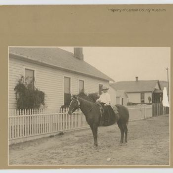 Update 2009: Black and white print. Photo of a young lady seated on a horse. Young lady has on a flat brimmed hat, long sleeved shirt, riding gloves, long dark skirt. She is mounted in a saddle with the reins in he right hand. There are houses in the background with a fence between horse and rider and the houses.