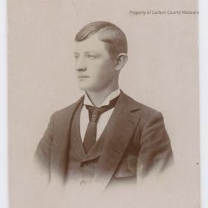 Update 2009: Sepia print. Photo of a young man in a dress suit and tie. Hair is parted on right side cut short, combed to left side.