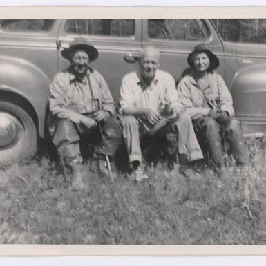 Update 2009: Black and white print. Snapshot. Image of two men and one woman seated on the running board of a 4 door automobile. All are dressed in casual clothes. Woman and man on left wearing waders and holding fishing poles. Grass in foreground. Trees in background. Image out of focus.