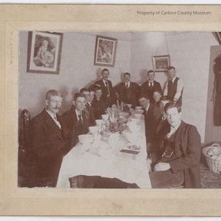 The Owl Club dinner in Club room in Rawlins. Left to Right: ?, Bob Jungquist, Bing Price, Hugh Murray, Ed Bennett, William McKay, ?, Fritz Dennison, W. W. Daley, ?, James Rendle, ? Turk Batsford. Taken November 19, 1895.