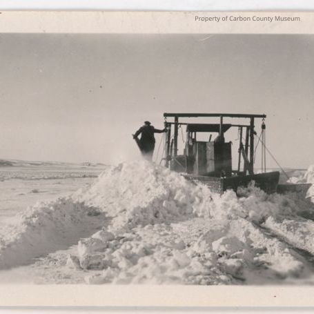 Update 2008: Black and white print. Snapshot. Image of large piece of snow removal equipment moving through deep snow. Man standing on side holding up an outside blade?