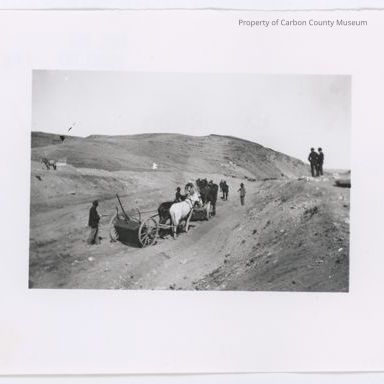 Update 2009: Black and white glossy photographic print showing a barren hill in background with two men standing on another small hill side right. A group of men with horses and horse drawn equipment are seen at center of print on a lower level at surface going up a slight incline. Man on left is standing behind the small box looking at wheeled two horse pulled unit and is holding the very long reins attached to horses.