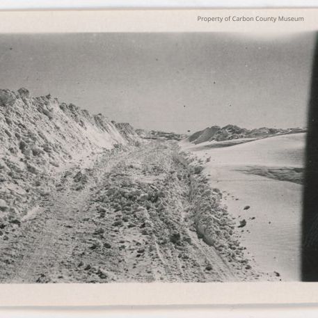 Update 2008: Black and white print. Snapshot. Image of churned up track through deep snow with a large pile of snow along the left side. Right side of image blocked by person or edge of equipment.
