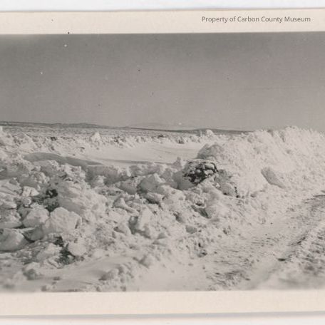 Update 2008: Black and white print. Snapshot. Image of mounds of churned up snow and drifts on a flat plain. Hills in background.