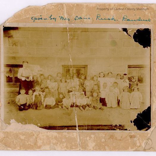 Written on back in blue ink: "Kindergarten class Miss Murchison teacher, first Kindergarten teacher in Rawlins." "1906 or 1907".