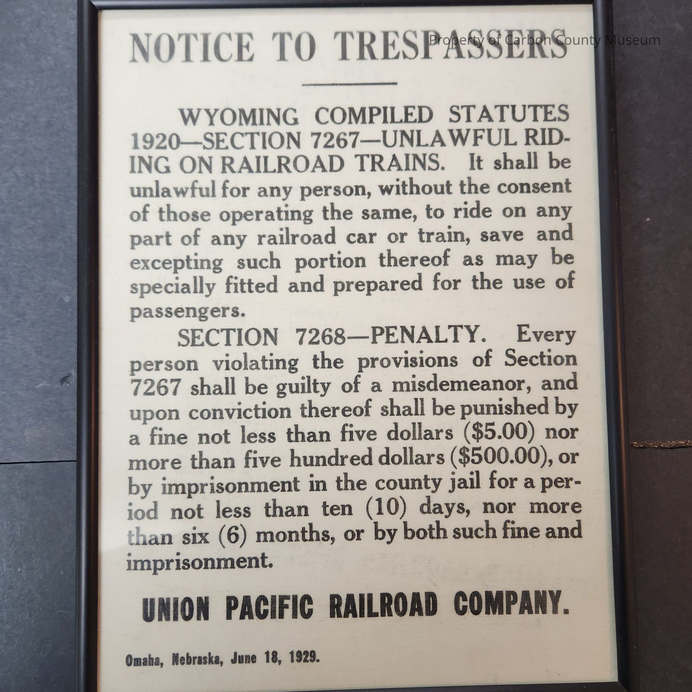 Notice from the Union Pacific Railroad in regard to illegal train rides and the associated penalty. Appears to be printed on canvas/textile. Framed.