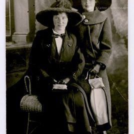 Update 2/2010: Black and white print. Studio portrait. Printed on postcard paper, unused. Full length image of two young women seated on a wicker bench, painted backdrop and window behind. Women are wearing long coats and wide-brimmed fur hats with feather plumes. Each is holding a small light colored, see-through purse.