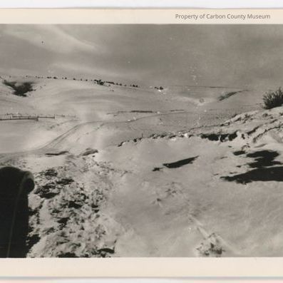 Update 2008: Black and white print. Snapshot. Image of a snow covered track through a snow covered rolling plain. Some bushes, trees and fences visible amount the drifts. Front fender and headlight of a vintage vehicle in foreground left.