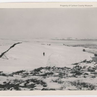 Update 2008: Black and white print. Snapshot. Image of large snow drift collected on either side of a snow fence and extending across a road. Wide expanse of prairie in background with road running into the distance. Bridge at center right side with automobile on road, just past drift . Person standing on drift at center.