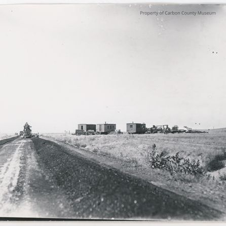 Update 2008: Black and white contact print. Snapshot. Image of a road paving operation with a pile of loose material along each side. Large piece of equipment on road left of center. Three gang shacks, automobiles and equipment clustered together on road side in midground. Structures, fence and two vehicles in background at left.