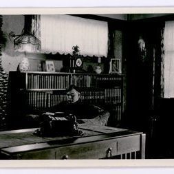 Update - January 2010: Black & white print. Snapshot. Image of a man seated in an upholstered chair, reading a book. Table, with series of books between decorative bookends on top in foreground. Second chair at right. bookcase of books, photos & knickknacks behind man. Cobblestone fireplace at left. Windows in background center & right.