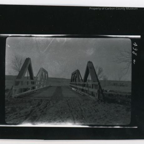 Update 2008: Black and white contact print from sheet negative. Snapshot. Image of a wooden bridge spanning a creek or ravine. Side rails of bridge are geometric wooden structures. Triangular at front and trapezoidal with diagonal cross members at back. Few bare trees visible with wide prairie in background. Dirt in foreground.