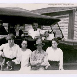 Update - January 2010: Black & white print. Snapshot. Image of a group of seven people sitting in & on a vintage automobile. Two men & a woman are inside the automobile. Three women & a man are sitting on the right side running board. Log structure in background. All appear casually dressed.