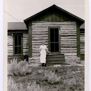 Update - January 2010: Black & white print. Snapshot. Image of a woman standing in front of a log house. she is standing on the left of a wooden stairway & wearing a half-sleeve white dress. Sagebrush in yard in foreground.