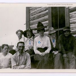 Update - January 2010: Black & white print. Snapshot. Image of 7 people sitting on the steps of a log building. All appear casually dressed; men & women in back row appear to have switched hats.