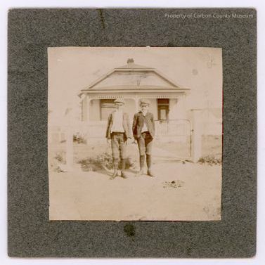 Photo of Willard and Dave Rusk in front of house now owned by Mrs. Fritz Dennison on Maple St, Rawlins.
