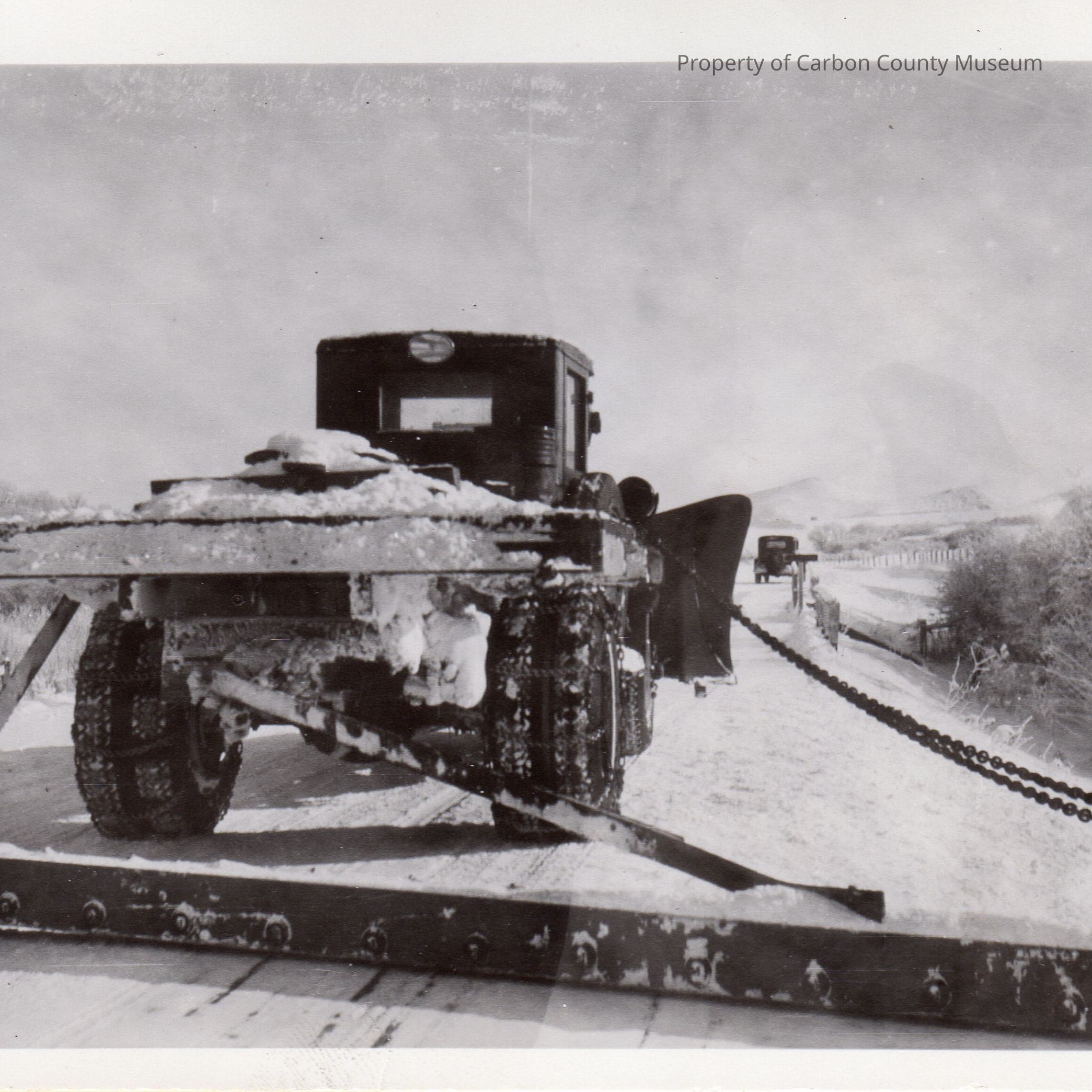 Update 2008: Black and white print. Snapshot. Image of a large truck with a blade attached to front and long metal faced wooden bar attached behind. Truck tires are chained and it is moving down a snowy road with scrub brush and trees on either side in the mid ground at a bridge. Another vehicle and fence, trees and hills visible in background.