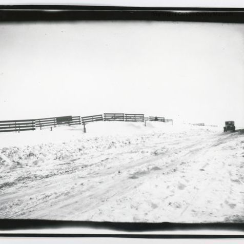 Update 2009: Black and white contact print of car traveling down snowy road. Snow fence is in photo left. Snow has been plowed to sides of road but ruts remain in road.