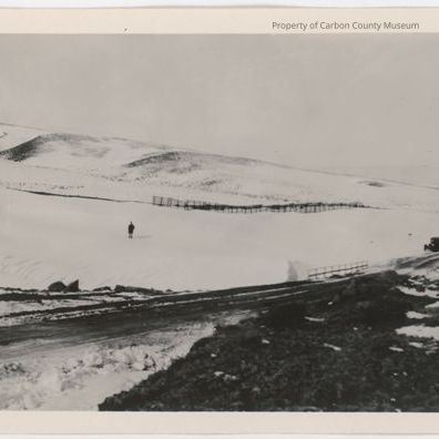 Update 2009: Black and white print of a man standing on a large snowdrift in the distance. In the foreground is a road that crosses a draw with a bridge railing. A vintage car is setting along roadside. There is a snow fence behind men and hills beyond fence. Foreground is dirt and rocks.