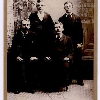 Update 2008: Black and white cabinet card 4 1/4 x 6 1/2, mounted to tan matboard. Portrait of four men with a backdrop scene of brick wall, Victorian house, foliage and a staircase. The two men in front are seated on chairs dressed in dark suits and ties. They both have large mustaches. The man on left has a fancy walking stick in his right hand holding it upright. Man on right is holding a black bowler hat in his lap with his hands on each side of the brim. The man standing up photo left rear is wearing black 3 piece suite with white shirt and cravat. He is holding a black bower hat with crown side up in his right hand. He has medium hair and large mustache. The man on right rear has 3 piece suit on with wide black patterned tie tied with two flaps showing. He is clean shaven and wearing a pair of pince-nez glasses. Flooring of studio is a decorative checked linoleum which is cracked and worn.