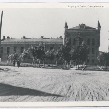 Update 2009: Black and white print of Wyoming State Penitentiary. Multi-level rock building with two spiral towers on top level. Gable roof window is between them. Three levels of rectangular windows below five square windows. To building left, roof is lower and has four round exhausts. There are nine large windows in that part of building. A water tower is seen in photo right. Several rows of trees are growing in front of the penitentiary. There are two adults and one child walking toward building. A large dirt street in foreground.