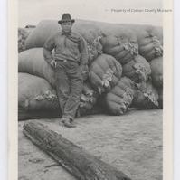 Update - 2009: Black & white print. Snapshot. Image of a man leaning against a large pile of large bags of wool. A piece of telephone pole? lies in the dirt of the foreground. Man is dressed in medium colored work clothes, tie, hat & boots. His left ankle is crossed over his right.