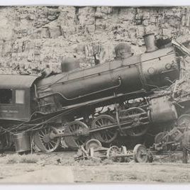 Update 2/2010: Black and white print. Snapshot. Printed on postcard paper. Unused. Image of the aftermath of a train wreck showing a steam locomotive that appears to have crashed into the back of another train. the engine has been lifted up off the tracks and the engineer's cabin has been pushed back into the tender. Engine No. 266; Union Pacific. Rocky hill in background. Three men standing at right near collision point; pile of axles and wheels at center next to them. Fourth man is climbing up on the side of the engineer's cabin to look inside.