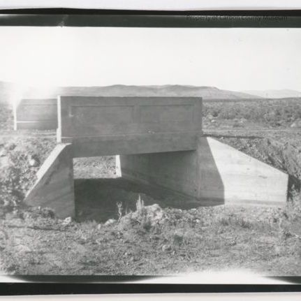 Update 2009: Black and white contact print of concrete bridge. Bridge buttress fans out beneath bridge on sides. Bridge has solid concrete sides. Written on left edge in white:"472b"