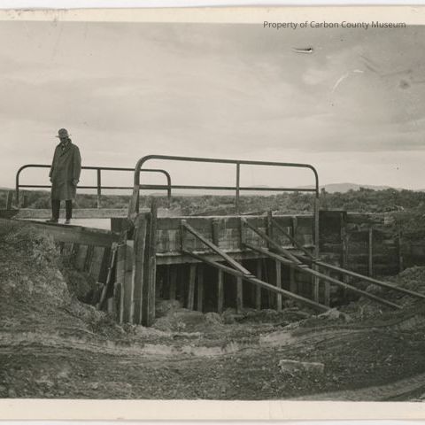 Update 2009: Black and white print of bridge under construction. On foreground side there are boards bracing side. Top of bridge sides are metal pole railings. There is a man standing on end of bridge. Boards are standing vertical beneath bridge. Buttress ends are boards standing on edge.