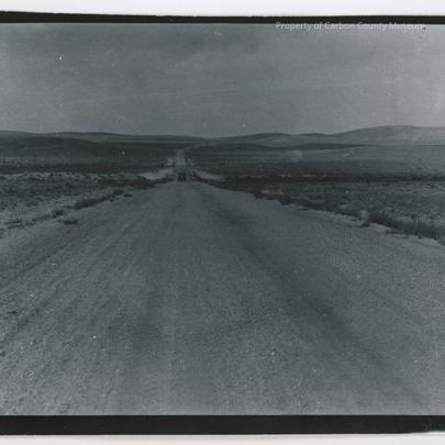 Update 2009: Black and white contact print of gravel road. Road is wide in foreground and narrows in distance across rolling hills. Both sides of road are low brush, sparsely vegetated. There is a line of power poles in photo left. A car is on the road in the distance .