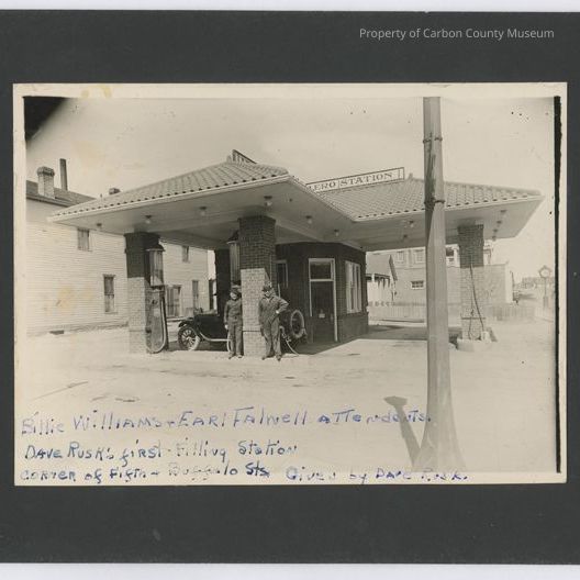 1. 7 x 9". Written in blue ink on emulsion surface along bottom edge: "Billie Williams & Earl Falwell attendents" "Dave Rusk's first filling station corner of fifth & Buffalo Sts."