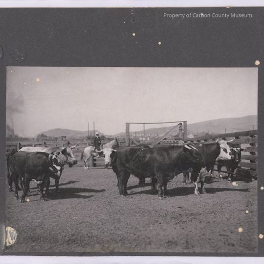 Update 2/2010: Black and white print. Snapshot. Mounted on dark grey matboard. Image of a small group of cattle inside a corral. Man mounted on a light colored horse in mid-ground at center. Man is wearing a dark suit and a light colored hat. Buildings and hills in the background. Written on original negative at center at gate: "No. 8".