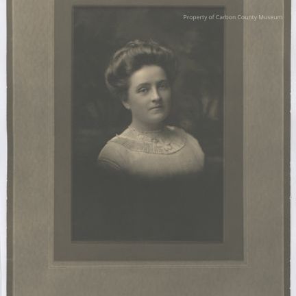 Update 2/2010: Black and white print. Studio portrait. Printed on patterned paperboard that looks like a mat with dark and light borders. Head and shoulders portrait of a young woman wearing a light colored dress with a pleated and lace collar. There is a bow at center front of collar and she is wearing a necklace with a circular pendant. Her hair is pinned up. Painted backdrop behind.
