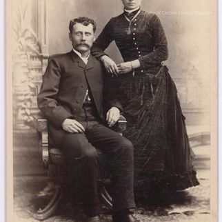 Update 2009: Black and white print. Studio portrait. Painted backdrop. Image of man in a dark suit seated in a chair. Woman standing next to and leaning on man's shoulder. Man has short dark hair and mustache. Woman has dark hair pulled up. Dark full length dress and wearing a necklace.