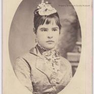 Update - 2009: Black & white print. Studio portrait. Mounted on pink matboard. Oval head & shoulders portrait of a young girl wearing a fancy lace-covered satin dress with high ruffled lace collar & lace neck piece. Her hair is pinned up with a lace & berry hair pin. Painted backdrop behind.