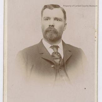 Update - January 2010: Black & white print. Cabinet card. Studio portrait. Mounted on white matboard with gilt edge. Head & shoulders portrait of a man dressed in a 3-piece suit, dark tie & white shirt. His hair is short & he wears a full trimmed beard.