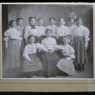 Photo of the Junior Queen Esther Circle of the Methodist Church in Rawlins, Taken April 14, 1906. Front Left to Right: ? Glazier, ?, Paulsen, Paulsen, ?, ?, Florence Alcorn, ?,. Bottom row: Florence Buchanan, Grace Friend, Ruth Glazier.