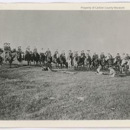 Update - 2009: 2 original black & white prints & 1 copy print. Snapshot. Image of a large group of men, all but 3 of whom are mounted on horses; posed on a grassy prairie. Hill in background. The three men who are unmounted are seated on the ground in front of the line of horses - two facing one another at right; one seated behind saddle at center.
