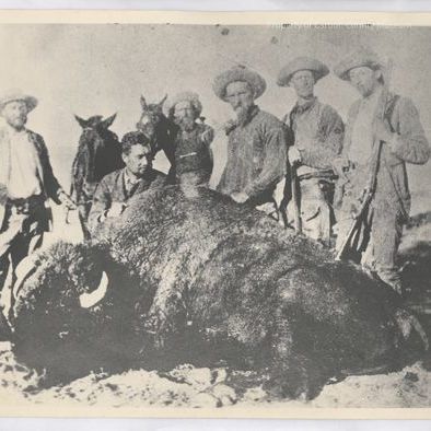 Update 2009: Black and white print. Image of a group of 6 men, two horses and a large dead buffalo. Very grainy. Two men on right holding rifles, man at far left also has rifle an is holding horses reins. Men casually dressed, all but one are wearing hats.
