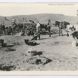 Update - 2009: Black & white print. Snapshot. Image of a group of men, horses & wagons gathered in an open area. Hills in background. Wagon with chuckbox at right. Pots & pans on ground in foreground. Men relaxing - some standing & some seated on the ground.