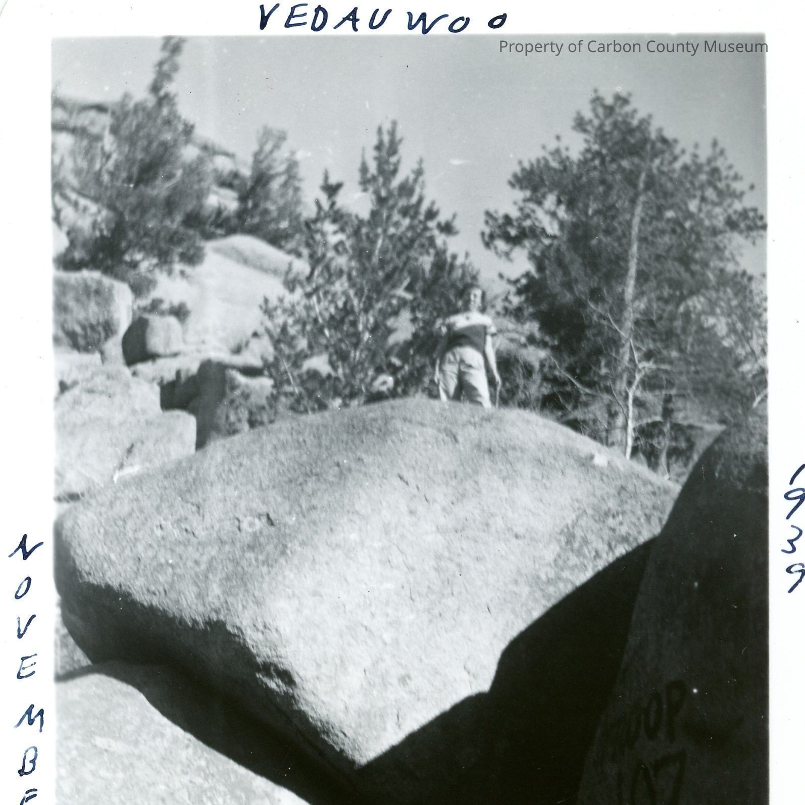 Black and white photograph. A picnic table is in front of large boulders, a woman is standing on top of of one of the boulders. Written along the top edge of the photograph is "VEDAUWOO", along the bottom "ME", vertically along the left "NOVEMBER", vertically along the right "1939". The number 25 is printed on the reverse.Collection