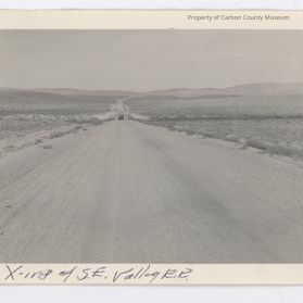 Update 2009: Black and white print of gravel road. Road is wide in foreground and narrows as it travels over rolling hills. Prairie on either side of roadway. A vintage auto is on road crossing railroad tracks.