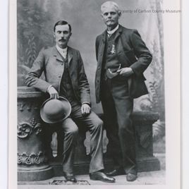 Update 1/2008: Black and white studio portrait. Image of two men, one seated and one standing. Printed scenery background. One man is seated on a baluster with his right arm resting on a short decorated column. He is dressed in a light colored plaid three piece suite, white shirt and dress shoes. He is holding a light colored hat. Man at right is standing in front of the baluster with his left hand tucked in his pants pocket. His right hand is behind his back. He is wearing a dark plaid three piece suit, white shirt, patterned tie and dress shoes. he is wearing a star shaped medal or pin and a watch chain.