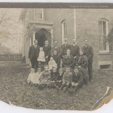 Update 2/2010: Black and white print. Snapshot mounted on grey matboard. Image of a large family group posed in the yard of a large brick house. Picket fence and bare trees in background at left. Group of six men, three women, three boys, three girls, one toddler and one infant. Men are standing at back, women are seated on chairs in center with toddler standing on a chair at left and infant in woman's lap at center. Children are all seated on the ground in front with legs stretched out before them.