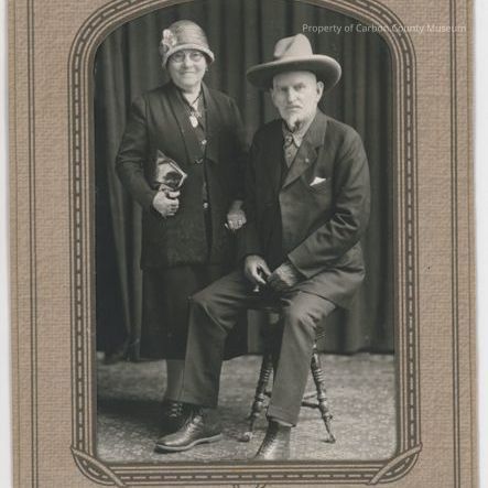 Update 2009: Black and white studio print of Boney and Martha Earnest(when older) encased in a folding ecru colored matboard frame. Frame is foldable to make a flat easel type display of photograph with triangle shaped flap to tuck into slot edge of opposing fold. The frame of the matboard is shaped with an arch curve at the top and a square bottom. A decorative printed border encircles the outer edge of the inner edge of frame surrounding photo. Print shows a dark curtain background with Mrs. Earnest wearing a three piece dark suit, holding a dark purse at her right side. She has a lighter colored cloche style hat with decorative flower on its right side. She wears dark wired rim glasses. Her left hand shows several rings on ring finger and forefinger. Mr. Earnest is seated on a three legged stool, wearing a dark three piece suit, pattered shirt, hankerchief in top suit pocket and a lighter colored felt looking wide brimmed hat. He is holding a lit cigar in his right hand which is propped on his inner thigh. He has a slight mustache and goatee. He is wearing dark leather mid heighth tie boots.