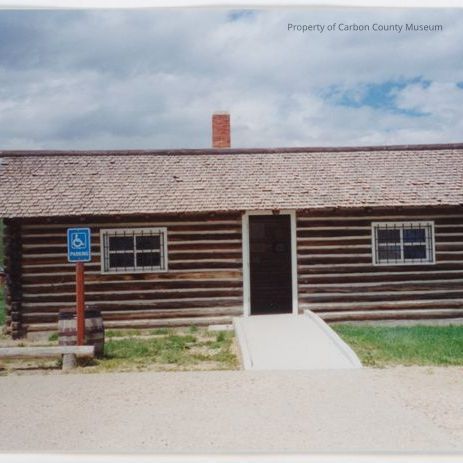 Update 2009: Colored print of a white chinked log building with a door in the center and a small 4 panel window on each side. Has wooden? shingled roof with chimney rising from back center of roof. A white walkway extends from roadbed to front door. A blue handicap sign is seen lower left by log railing.