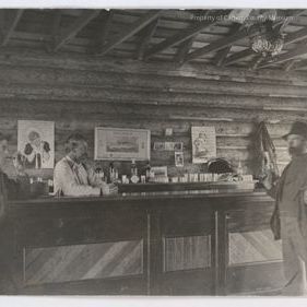 Update - 2009: Black & white print. Snapshot. Printed on postcard paper. Image of the interior of a saloon set up inside a log building with open rafters under a slatted roof. Four men in casual dress in saloon - 1 behind bar & 3 customers. Man at left is smoking a pipe & looking at man in front of bar at right - this man is brandishing a revolver & holds a cigar. Third customer is at the end of the bar at right.