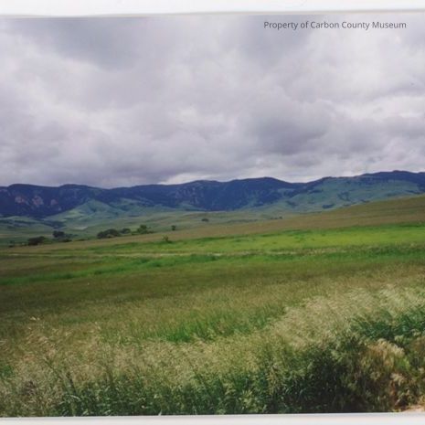 Update 2009: Colored print of Ft. Kearney. Print shows billowing green plants in foreground with meadowland extending to background with eight purple mountains seen in far background with full cloud cover in skies.