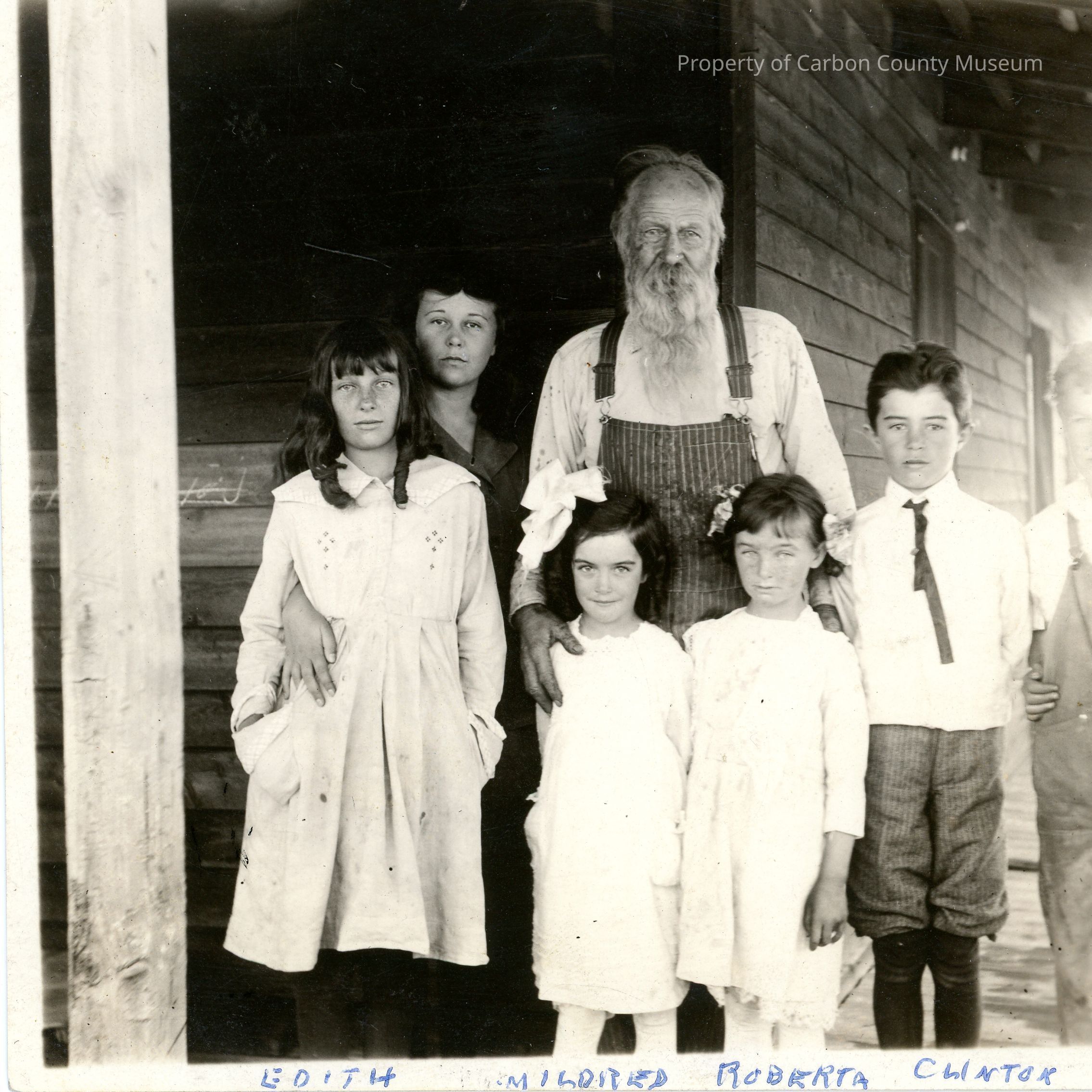 Black and white photograph. An elderly man is standing on the porch of a wooden structure. Beside him is a teenage girl, in front of them are five children. Written along the top edge of the photograph is "Mary" and "Grandad Buchanan". Written along the bottom edge of the photograph is "Edith", "Mildred", Roberta", "Clinton", and "Gilbert". Written on the back in blue ink is "Gilbert Dallas Buchanan". Other writing on the back reads as follows: