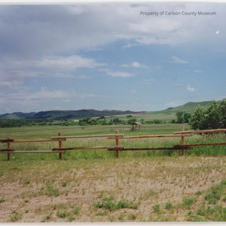 Update 2009: Colored print of Ft. Kearny. Print shows sparse vegetation in foreground with wooden rail fence. Extending from fence is a grassy field with hills and low mountains in background. Blue sky with clouds are seen top half.